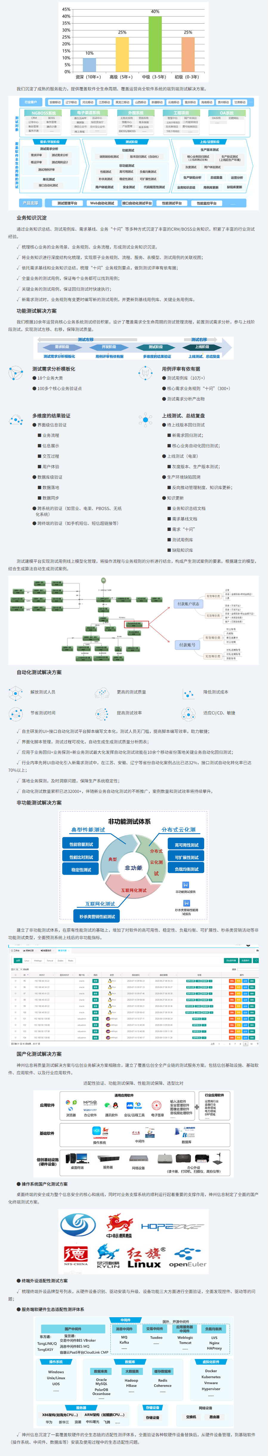 本方案包括功能测试方案、、、、自动化测试方案、、非功能测试方案、、、国产化测试方案、、、、用户体验测试方案,,为客户提供了高效、、、、高质量的测试服务,,,,为运营商行业软件系统的稳定运行和国产化发展提供了有力支持,,,创造了可观的价值。。